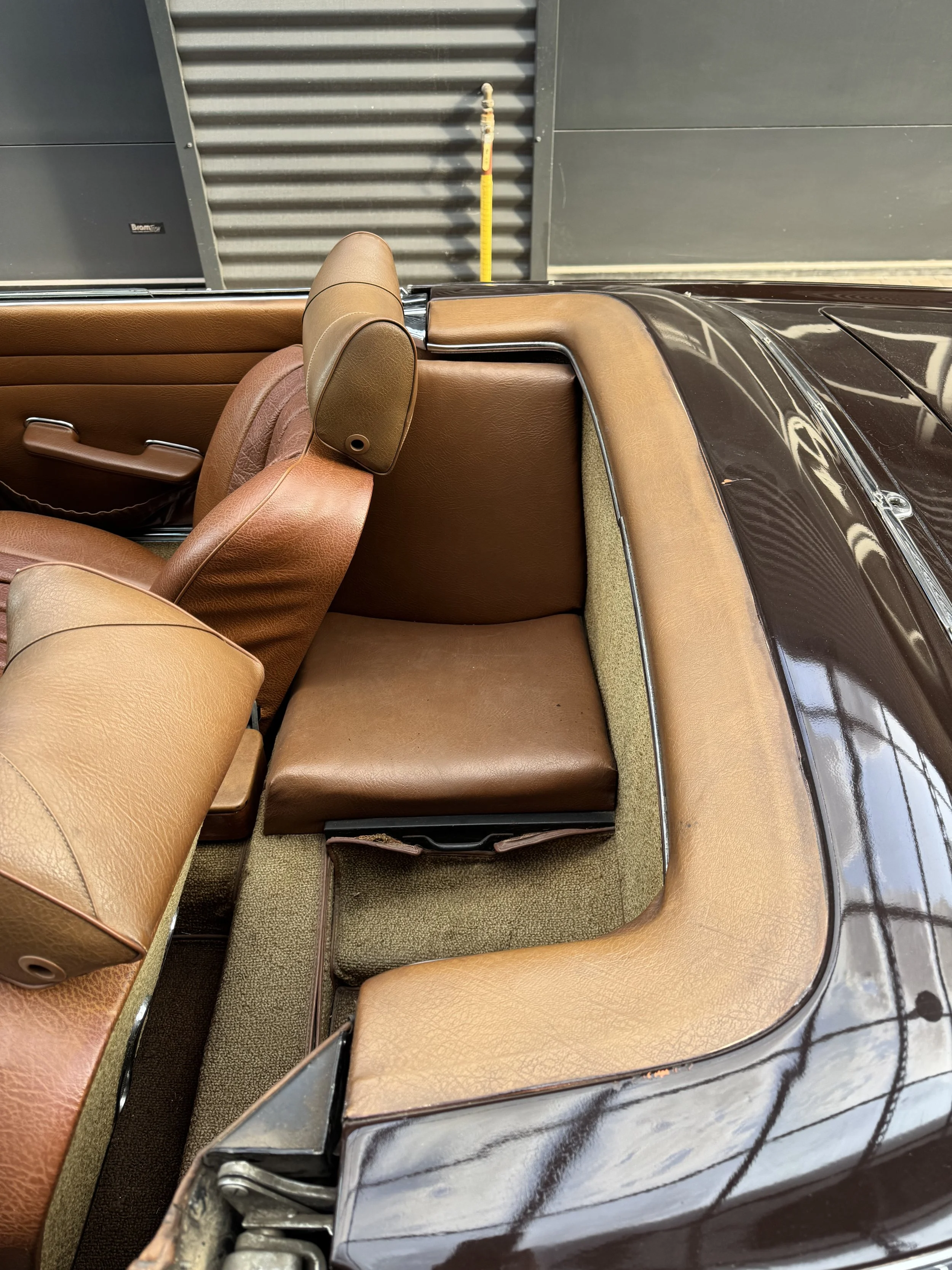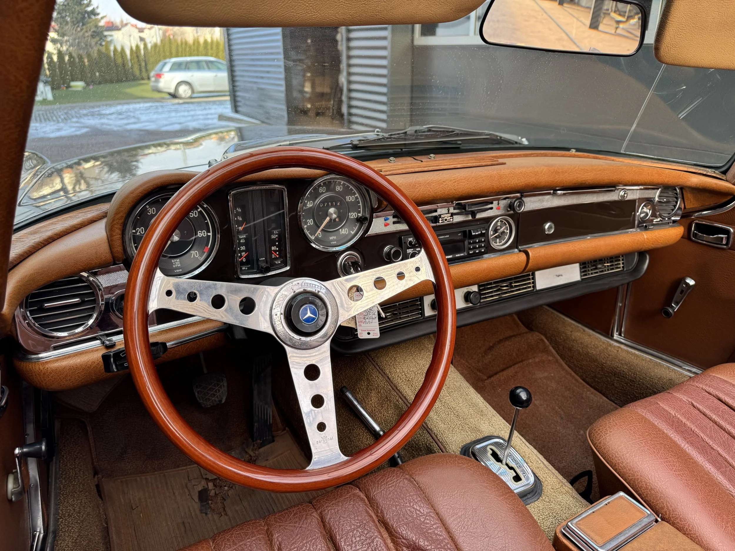 Ein besonderes Extra: Das Fahrzeug verfügt über ein Hardtop in Wagenfarbe (Tabakbraun), das den klassischen Look der Pagode unterstreicht. Ebenfalls verbaut ist ein hochwertiges Sportlenkrad von Personal aus Aluminium und Echtholz, das sportliche Eleganz ins Cockpit bringt.