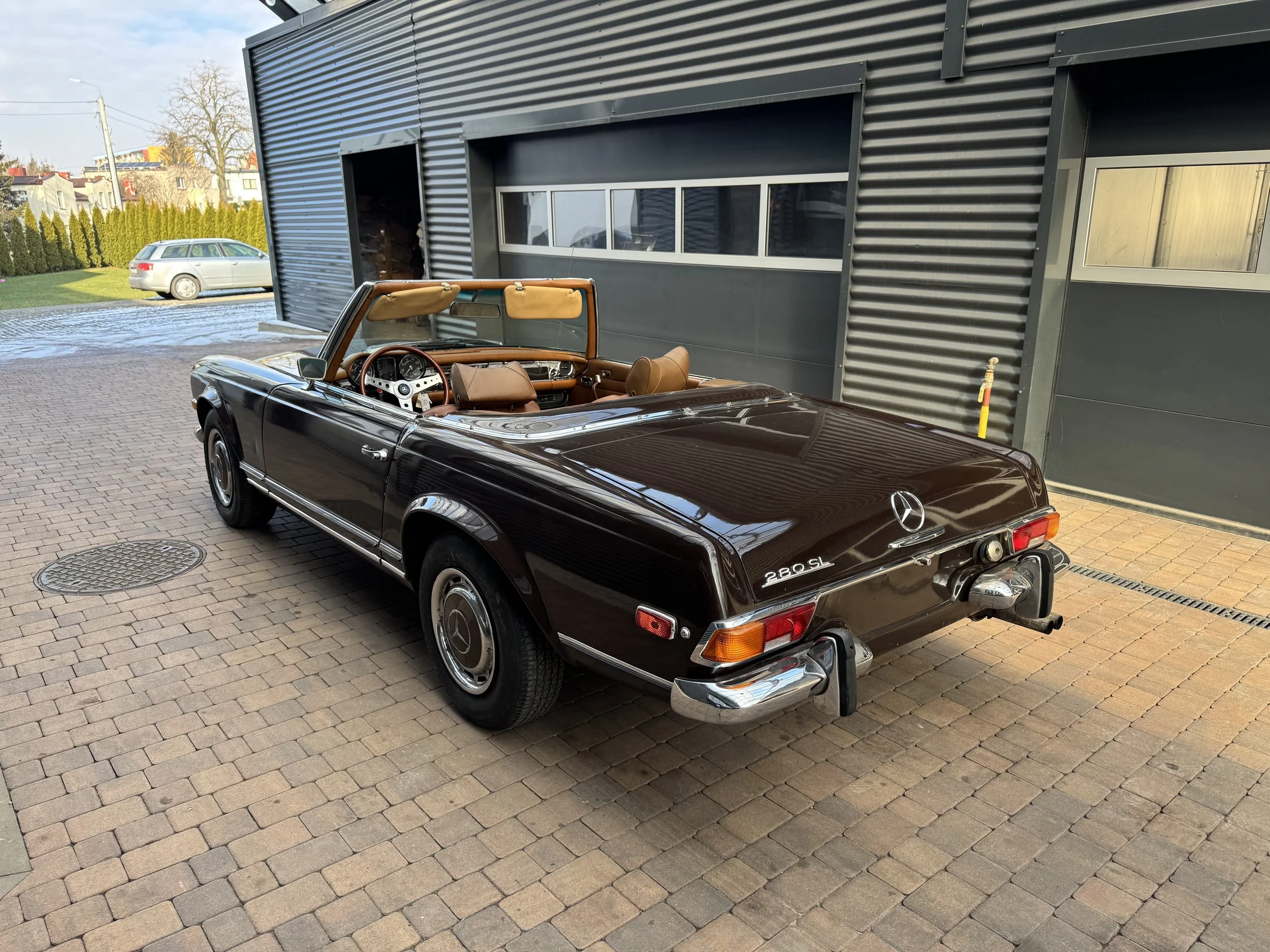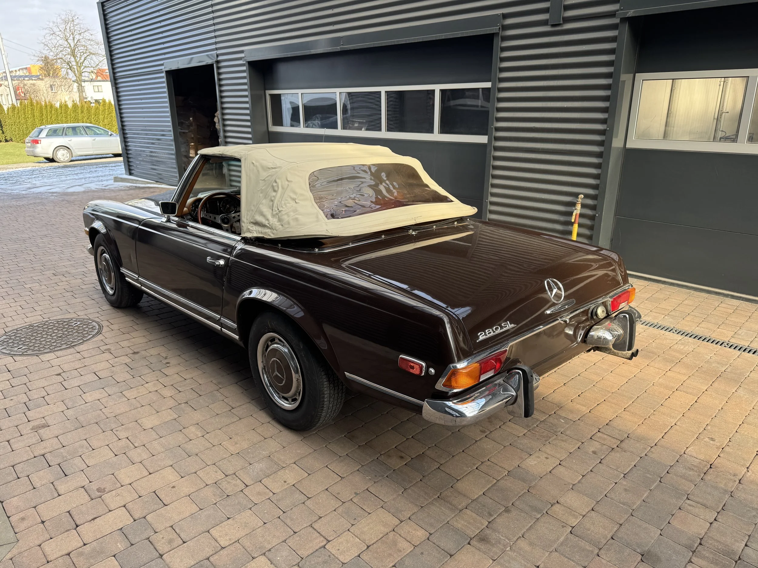 Zum Verkauf steht eine echte Ikone der späten 60er Jahre: Eine Mercedes-Benz 280 SL Pagode, gebaut im September 1969 und erstzugelassen im Jahr 1970, in der seltenen und stilvollen Farbkombination Tabakbraun (Farbcode 423)mit beigem Stoffverdeck (Beige/Natur) und passender brauner Innenausstattung.