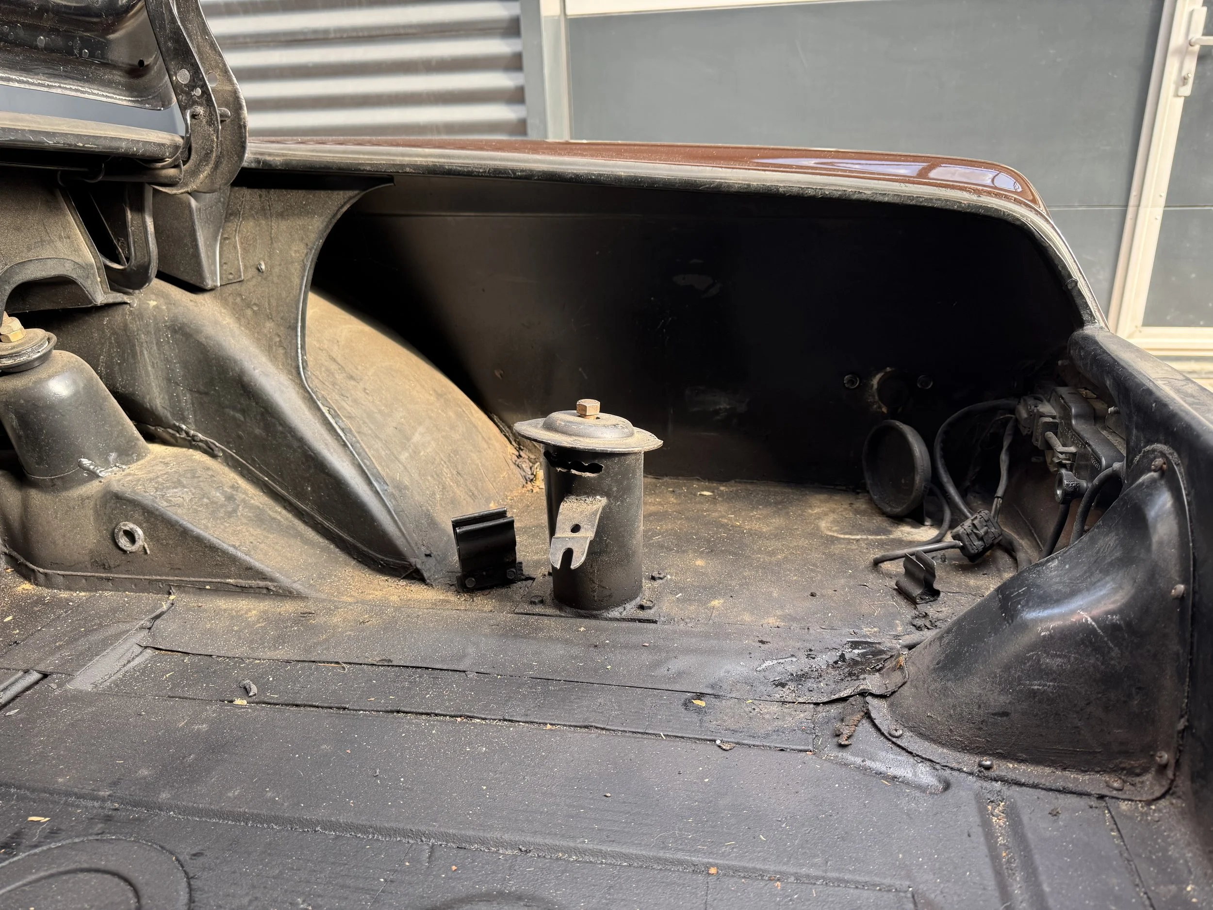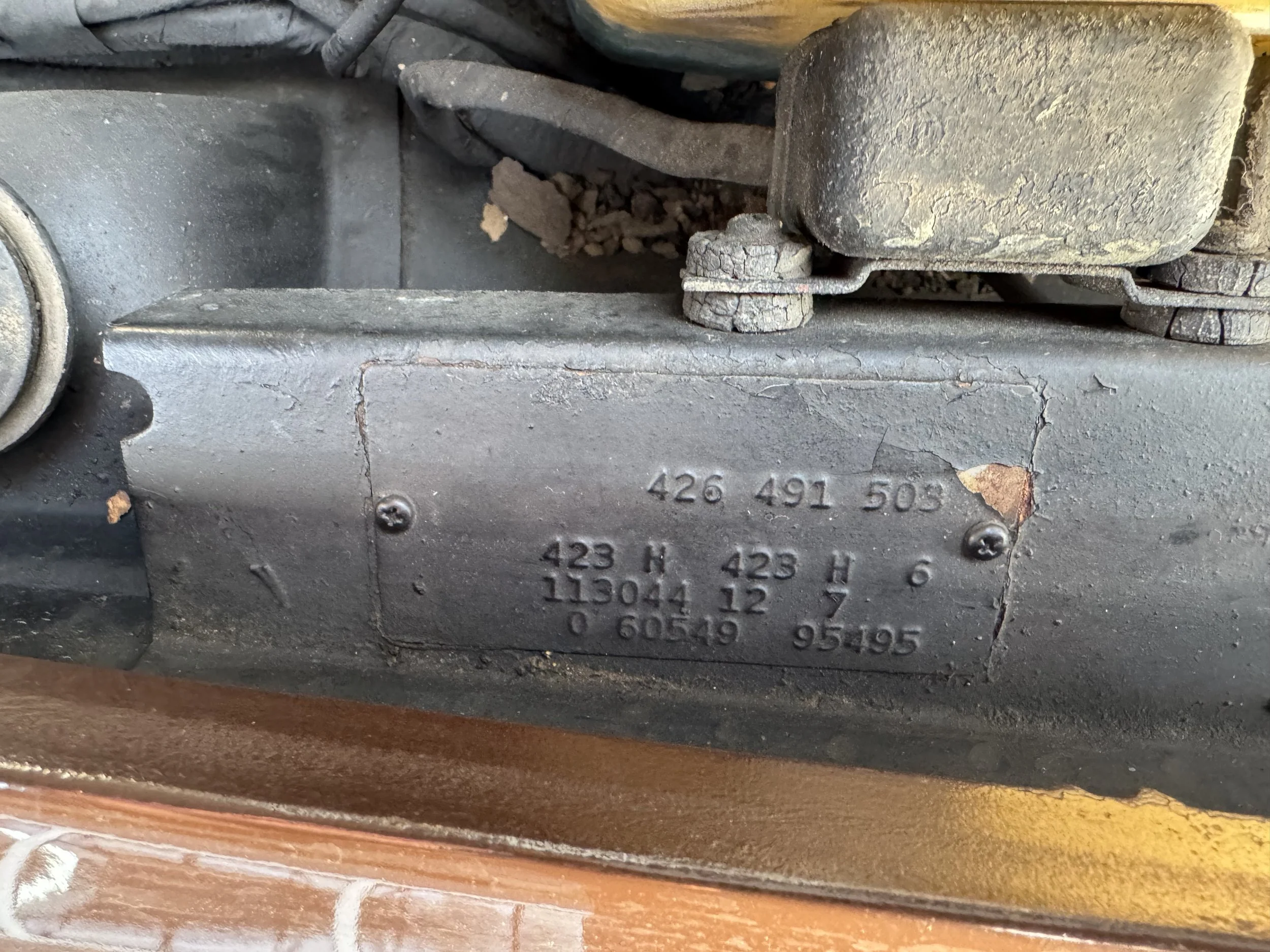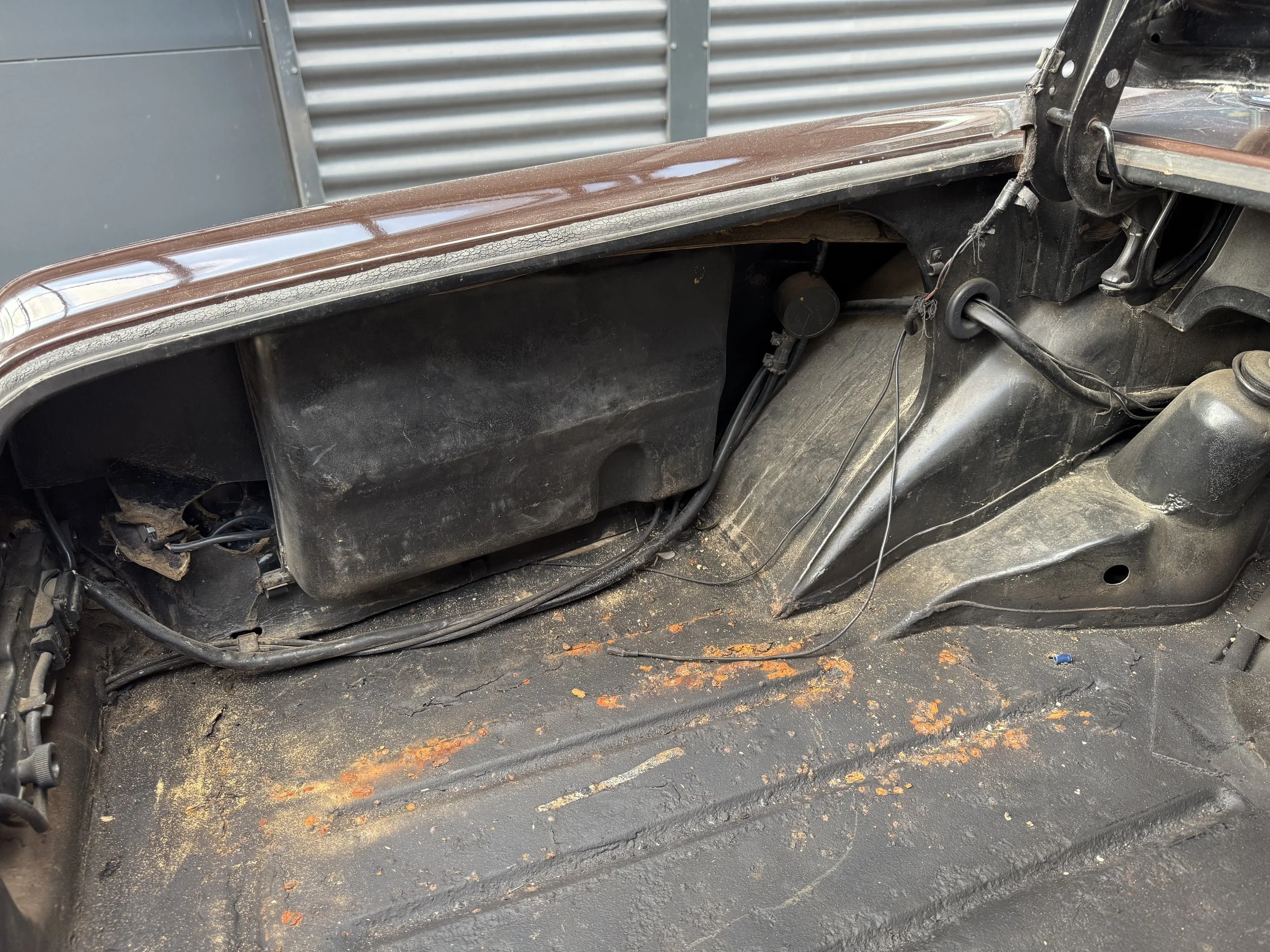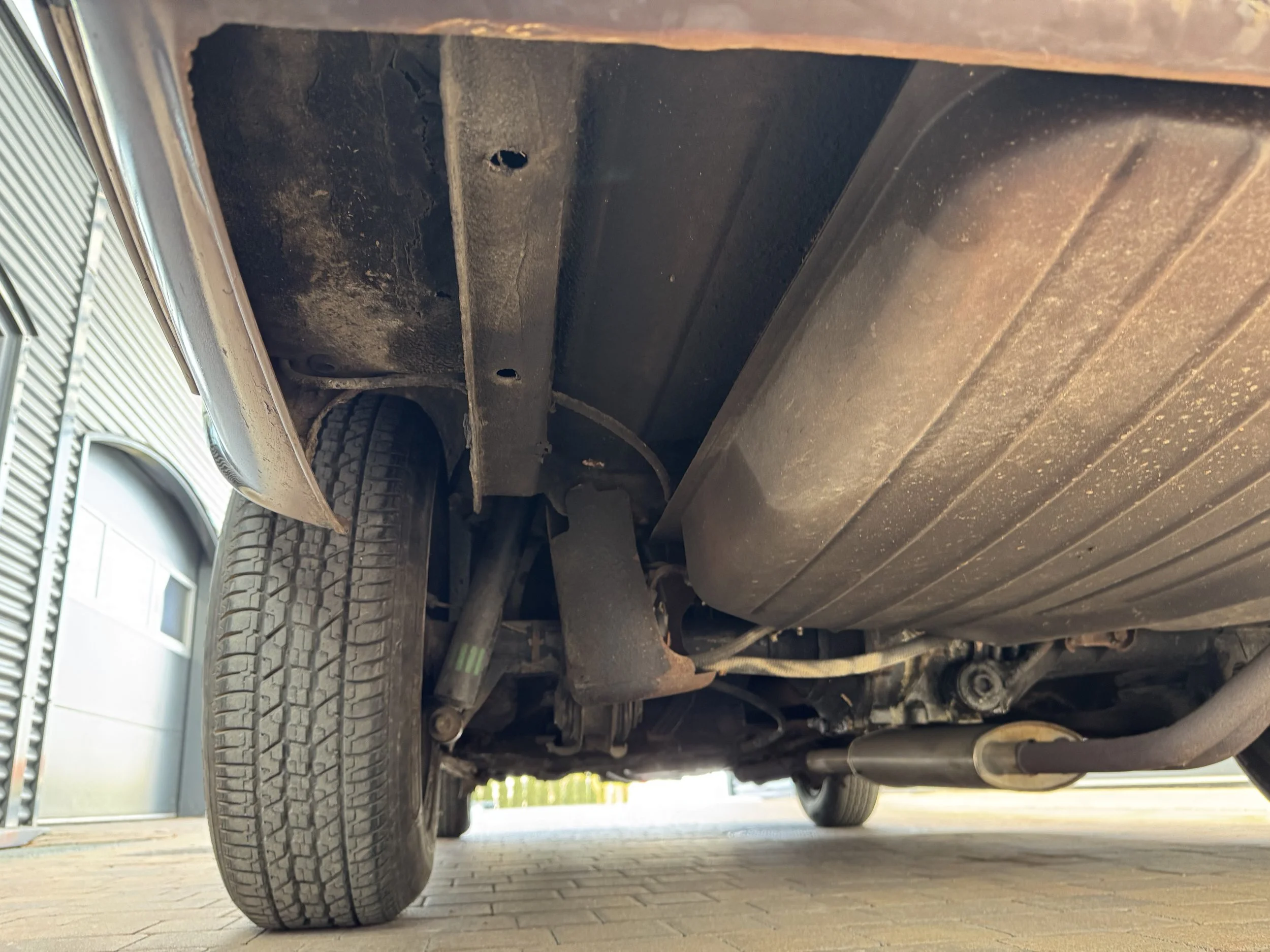 Die Karosserie ist vollständig und gerade, mit guter Substanz und lediglich geringem Blecharbeitsbedarf an typischen Stellen, wie auf den Bildern zu erkennen ist. Insgesamt bietet der Wagen eine sehr gute Grundlage für eine Teil- oder Komplettrestauration, je nach individuellem Anspruch.